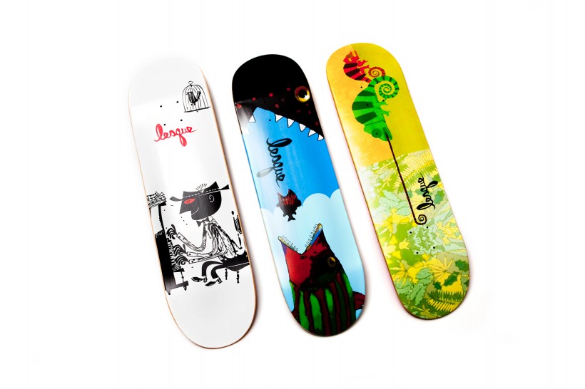 LesqueのTeamデッキ。左からPianoモデル(8×31.75)、Fishモデル(7.625×31)、Chameleonモデル(7.5×31.25)。すべて¥9,975