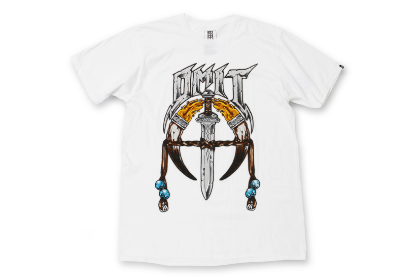 剣やアクセサリーを用いてブランドネームをかたどったグラフィックが特徴的なTee。¥3,990