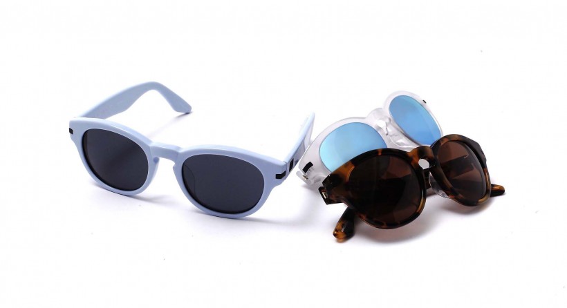写真左から時計回りに、Light Blue/Grey Lensモデル、Clear Frost/Blue Mirror Lensモデル、Camel Tortoise/Bronze Lensモデル。すべて¥12,600