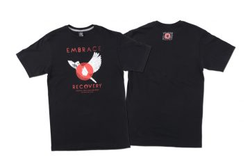 フロントにはヒバリをモチーフにしたデザインとEMBRACE RECOVERYのメッセージ、バックにはVOLCOM JAPAN DISASTER RELIEFとプリントされたチャリティTシャツ。¥2,700