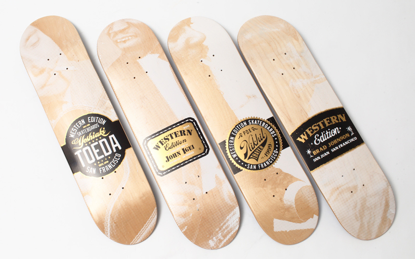 写真左から戸枝義明モデル(7.5×31.5 / 7.63×31.5)、ジョン・イゲイモデル(7.63×31.5 / 8×31.75)、ニキール・セイヤーモデル(7.63×31.5 / 7.75×31.5)、ブラッド・ジョンソンモデル(7.75×31.5)。すべて¥9,975
