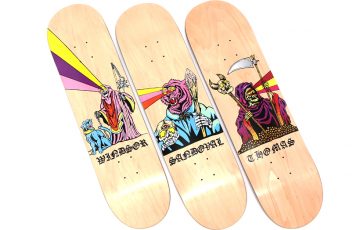 写真左から、Boss Dogシリーズのウィンザー・ジェームス(8×31.625)、トミー・サンドヴァル(8.125×31.625)、ジェイミー・トーマス(8.25×31.875)。すべて¥11,880