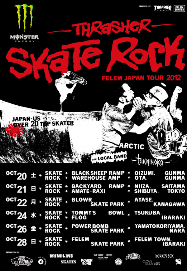 Thrasher Skate Rock Felem Japan Tour(バンドBad Shitとして)で現在全国ツアー中なのはThrasherの編集長であるジェイク・フェルプスとTNTことトニー・トゥルヒーヨ。さらにピーター・ラモンデッタとグラント・テイラーの目撃情報も多数上がっています。