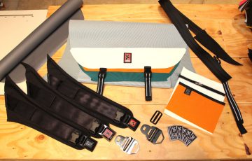 裁断された生地や各パーツを店頭で縫い上げバッグを製作します。生地は1050デニールナイロン11色、18オンスターポリン7色、EVAショルダーパット6色からチョイスし組み合わせます。