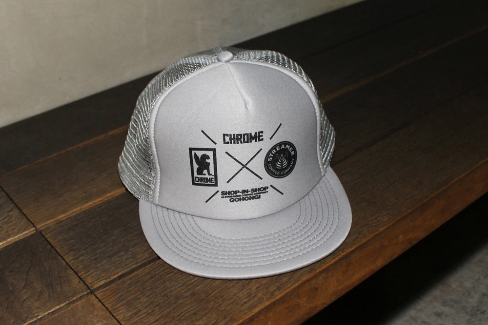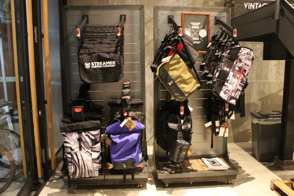 東急東横線のガード下、五本木交差点のほど近くに店舗を構えるStreamer Coffee Gohongiは、高架下ならではの高い天井とゆったりと過ごすことができる広大な店内が特徴的。さっそく中に入ると、入り口のほど近くにCHROMEの商品をところ狭しと展示してある一角(ショップインショップ)を発見。なかでも目を引いたのは、CHROMEのメッセンジャーバッグにStreamer Coffeeのロゴがプリントされたコラボアイテム。なんでも、ここでしか購入できない限定品とあってファンにはたまらないレア物だとか。