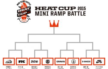 いよいよ明後日(18日)に迫ったHEAT CUP 2015 MINI RAMP BATTLE。DVS、ELEMENT、FTC、GRAVIS、G-SHOCK、LAKAI、NIKE SB、VOLCOMという8つのブランドがミニランプでスキルを競う今回のHEAT CUPですが、大会に先駆けこちらでトーナメント表を発表します。