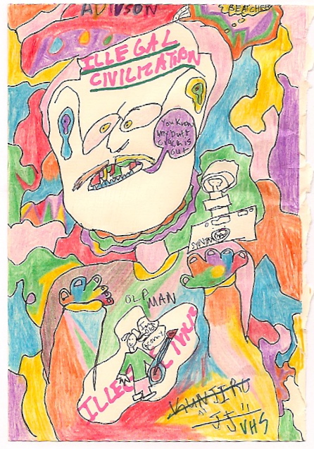 LAの悪ガキ集団ICことIllegal Civilizationの東京ツアーをVHSMAGでアテンドしたことは、以前Blogで書かせてもらいましたが、お礼(?)なのかは不明ですが、ICを主宰するマイキーからVHSMAGの特攻隊長JJのドローイングが先ほど届きました。ティーンエージャーの3人組に終始イジられていた43歳のJJは「なんで年寄り(OLD MAN)をイジるんだよ!?」ってツアー中彼らにずっと言っていたような気がします。Go Proだかなんだかの小型ビデオカメラが描かれているのも、JJのキャラクターをうまく表現しているのではないでしょうか。