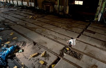恐る恐る…いや、ワクワクしながら中へと足をすすめた。どうやらここは造船所の廃墟。以前から、廃墟の光の中で撮りたいと思っていた。造船所のシャッターってスケールがでっかくていいなと。