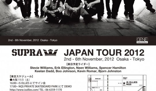 明日、11月2日~6日にかけて、SUPRAチームが待望のジャパンツアーを敢行。来日スケーターはスティービー・ウィリアムス、エリック・エリントン、リザード・キング、ニーン・ウィリア…