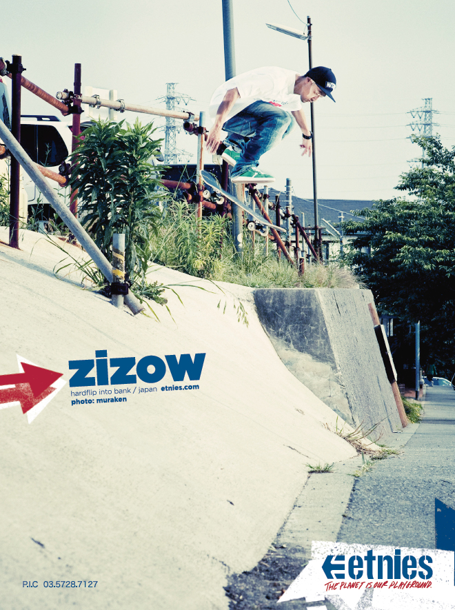 現在、フランスで生まれたetniesはアメリカを拠点にヨーロッパやアジアでもグローバルな動きをみせています。そしてここ日本でも吉田 徹、谷川祐馬、大矢尚孝、中平健児、高澤祐介、上原耕一郎、そしてZIZOWこと北村浩一と素晴らしいチーム構成。ということで、今回ご紹介したいのはetnies Japanの最新AD。ZIZOWによる、ハードフリップからのバンクイン。渋すぎます。