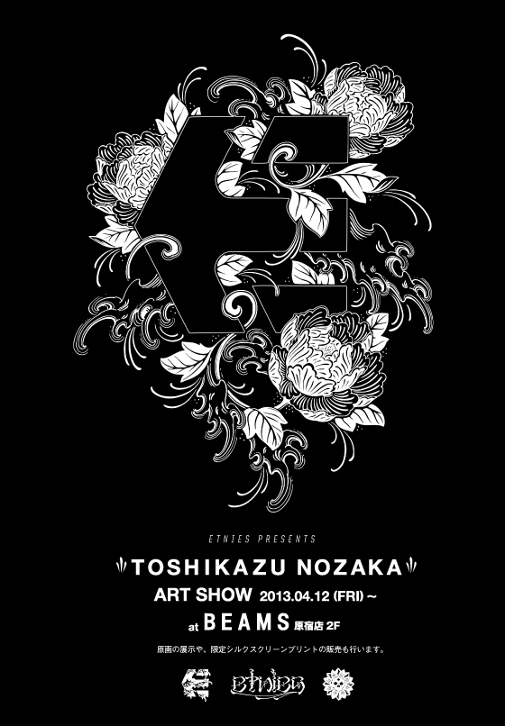 ’90年代にプロスケーターとして活動した後、現代美術家/タトゥアーティストとして、枠にとらわれない幅広い分野で活動している野坂稔和。最近ではetniesとタッグを組み、波やウロコをモチーフにしたグラフィックが配されたコラボシューズやアパレルコレクションを発表したのも記憶に新しい。そんな野坂氏のアートショーが原宿のBEAMSで現在開催されている。