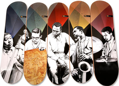 スケートボードとジャズの邂逅はスケートビデオのサウンドトラックとしてだけでなく、こうしたデッキのグラフィックでも行われているので、みなさんもよかったら手にしてみてはどうでしょうか?