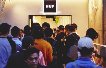 SFのチャイナバンクスをモチーフにしたエントランスやお客さんを迎えるピジョンのスカルプチャーなど、原宿の新名物にふさわしい注目ショップを一目見ようと多くの来場者が訪問。飛ぶ鳥を落とす勢いのHUFを象徴する一夜となった。