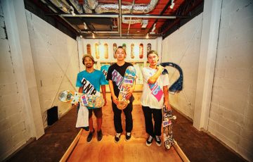 R.NEWBOLDの2015 AWコレクションを纏った岡本侑也、田中竜一、松井佑治の3人が、R.NEWBOLD京都店内に設置されたミニランプにてスケートセッションを披露。