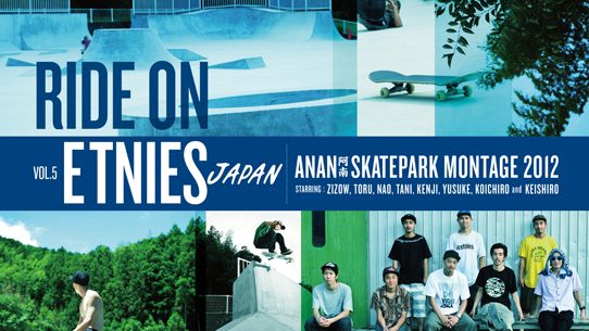 徳島県は、阿南スケートパークにて。日中は35℃を超える猛暑の中、ETNIES JAPANスケートチームは、2日間のスケートセッションを敢行する。最高のスポットで、最良の仲間たちと滑り倒す。