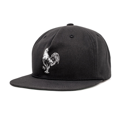 鶏のプリントを施したキャップとシンプルなニットキャップ。C-Bo JJE Snapback ¥5,400、Cien JJE Beanie ¥4,860