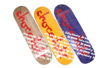 今年で20周年を迎えたChocolateから、記念シグネチャーモデルが続々登場。ボードグラフィックはもちろん、Chocolateで数々のアートワークを手がけてきたエヴァン・ヒーコックスによるブランドネームを描いたタイポグラフィ。これ以上、Chocolateの20周年にふさわしいグラフィックはないでしょう。このように色彩豊かな20周年記念シリーズを見ていると、彼らのこれまでの軌跡が目に浮かびます。