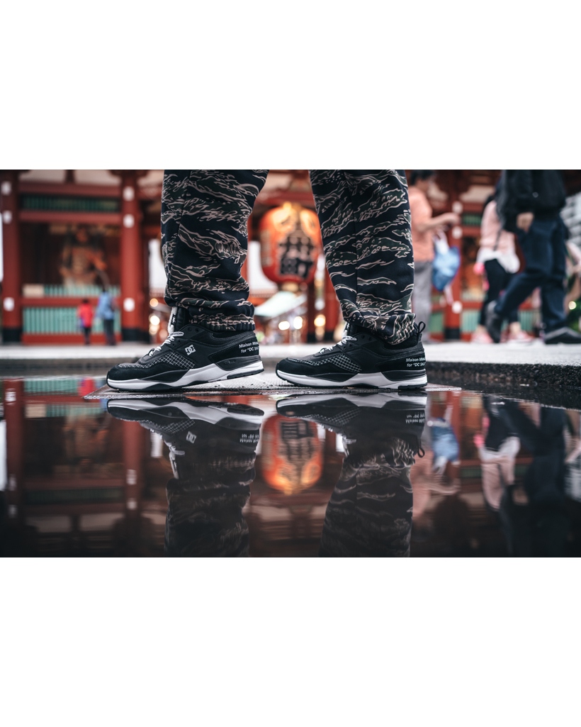 タン部分に大きくレイアウトされた起毛素材のDCロゴと両ブランドのロゴがプリントされたシューレースがアクセント。