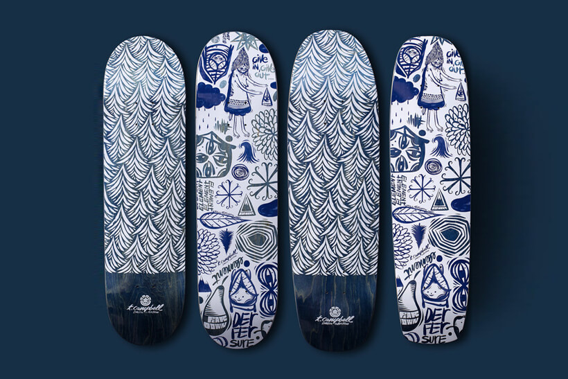 写真左から、Indigo Waves(8.25インチ)、Indigo Everything(8インチ)、Indigo Waves(Custom Shape 8.5×30.75)、Indigo Everything(Custom Shape 7.75×30.75)。すべて¥11,880