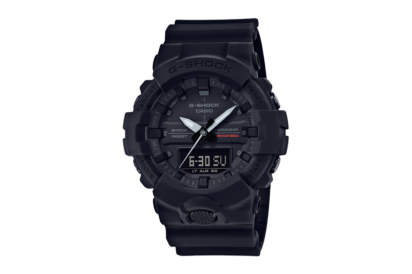 オールブラックのボディに白い針が映える。もちろん機能も充実。GA-835A-1AJR ¥21,600