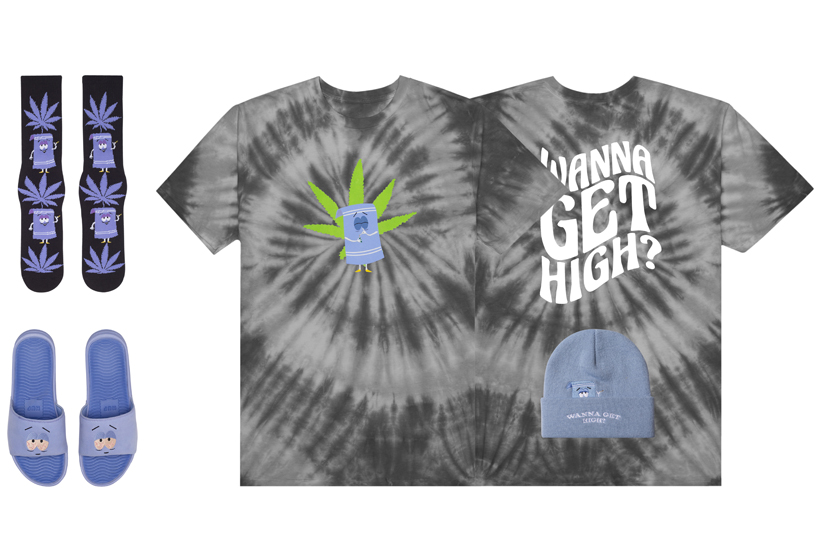 上段左から時計回りに、SP Towelie Plantlife Socks ¥2,808、SP Towelie Tie Dye S/S Tee ¥6,480、SP Towelie Beanie ¥4,860、SP Towelie Slides ¥7,344