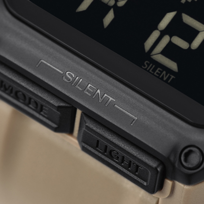 高い衝撃吸収性を誇るポロン素材内臓のボディには、過酷な環境に耐えうる機能を多数搭載。デュアルタイム、1/100の精密なタイム計測を可能にするデュアルクロノグラフにLEDバックライトを採用。100m防水はもちろん、水中でのプッシュ操作も可能。