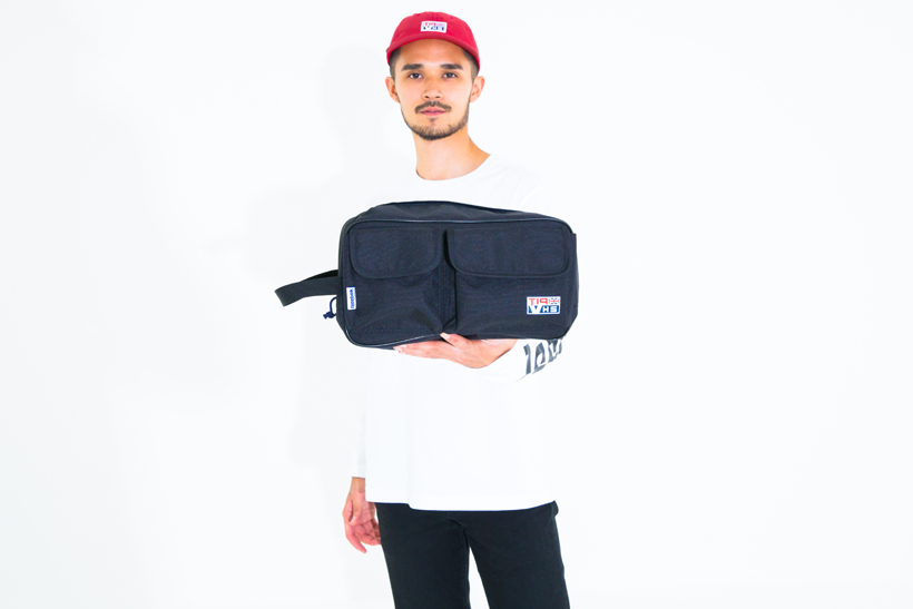 フラップポケットをふたつ採用することで、シューズの収納以外にもさまざまなシーンで重宝するシューズバッグ。T19 VHS Vector Shoes Bag ¥4,849