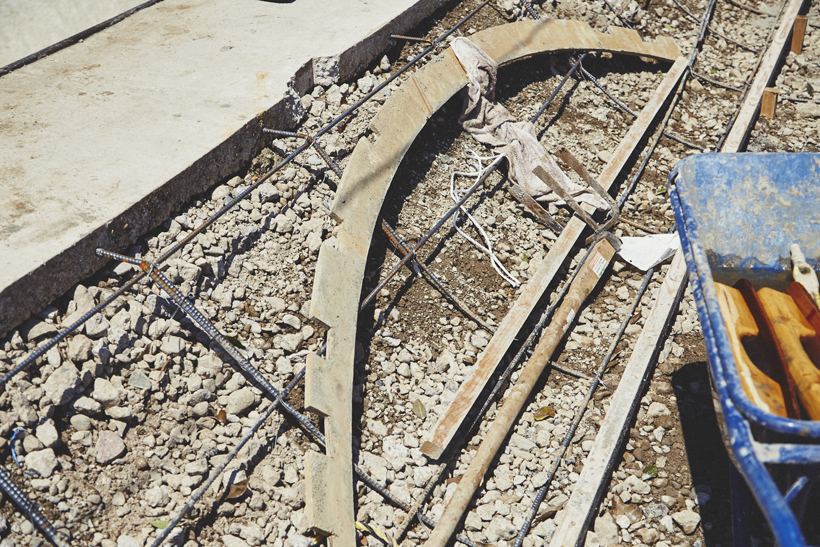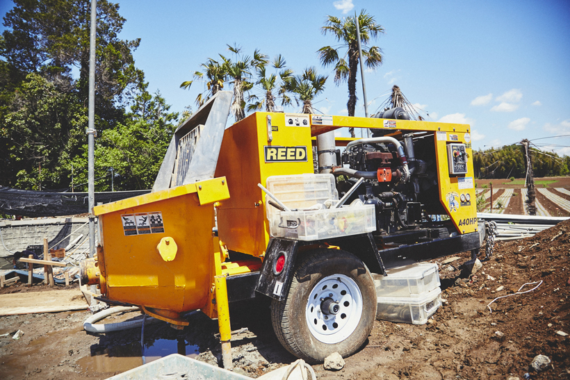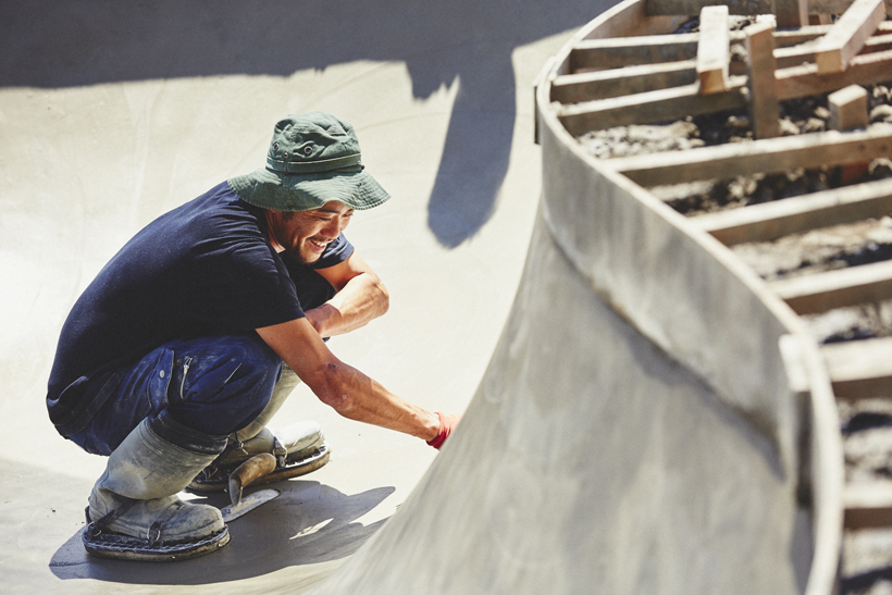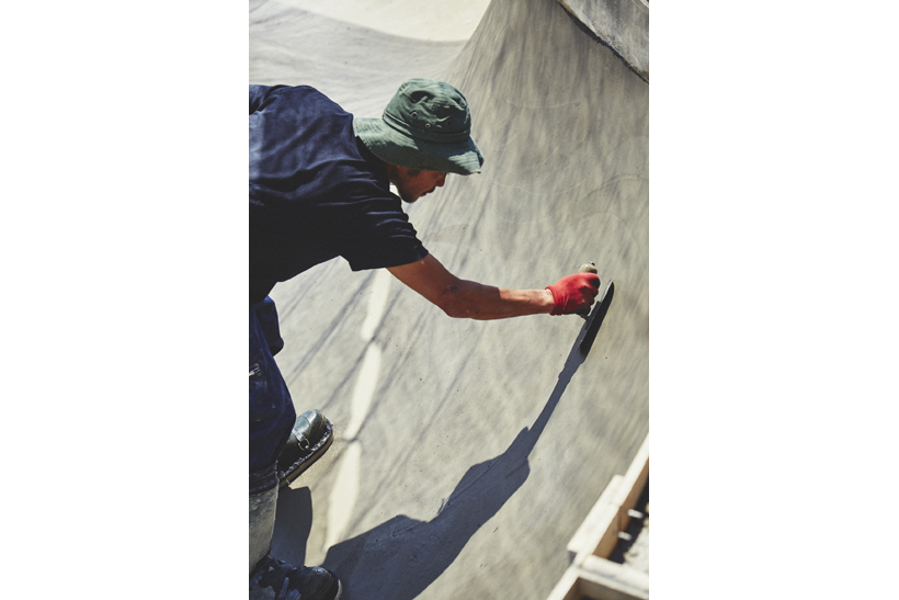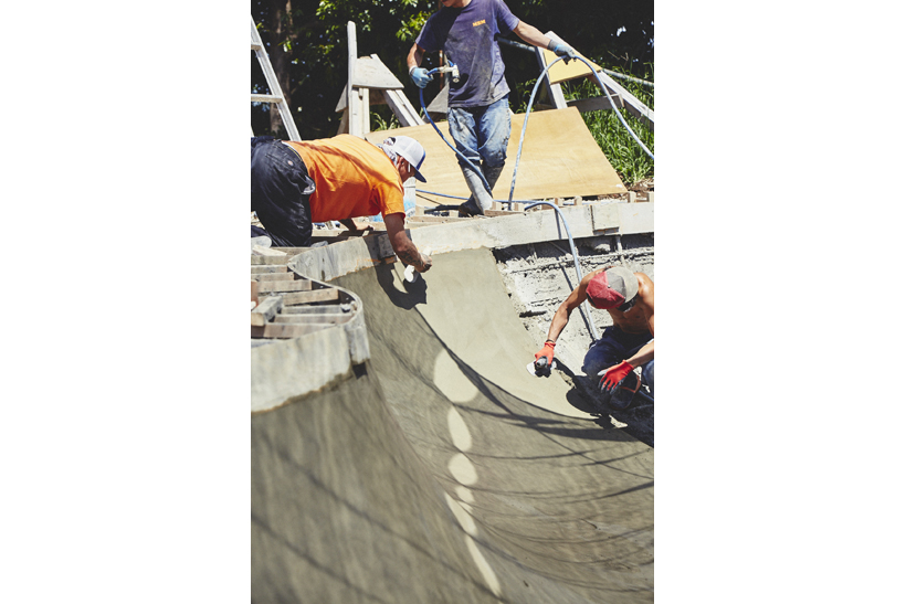 W: 今日は朝からコンクリートの打設ですね。表面にコンクリートを吹き付けて仕上げる作業。うちが使っているタイプの吹き付け用ポンプ車はまだ日本に1台しかありません。でもやっぱり、パークができた後に、作ったみんなで一緒に滑ることができるのがこの仕事の醍醐味ですね。そのためにみんな汗を流してがんばっている感じです。あと、こういう仕事は他にないと思うんです。というのも、アール面や斜面にコンクリートやモルタルを流して成形する仕事は特殊なんですよ。これはかなり難しい仕事なんで、他の普通の現場が楽になります。