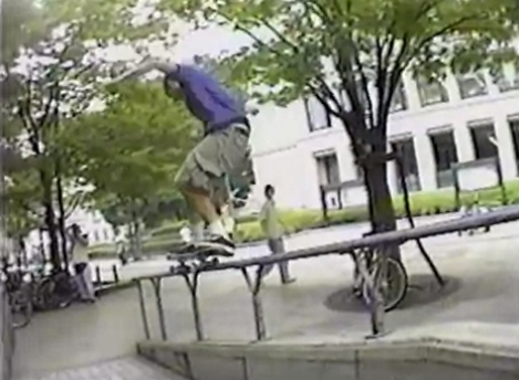 この当時Santa Cruzに在籍していたトム・ノックスは、ショーツスケートの代名詞的存在。このビデオパートもすべてショーツで撮影に望んでますね。これはもう暑さ対策というよりスタイルはいってます。当時彼がしてたように、片腕だけプロテクター着けて滑ってる人たくさんいたな~。