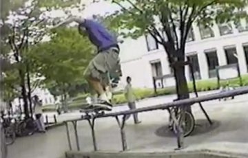 この当時Santa Cruzに在籍していたトム・ノックスは、ショーツスケートの代名詞的存在。このビデオパートもすべてショーツで撮影に望んでますね。これはもう暑さ対策というよりスタイルはいってます。当時彼がしてたように、片腕だけプロテクター着けて滑ってる人たくさんいたな~。