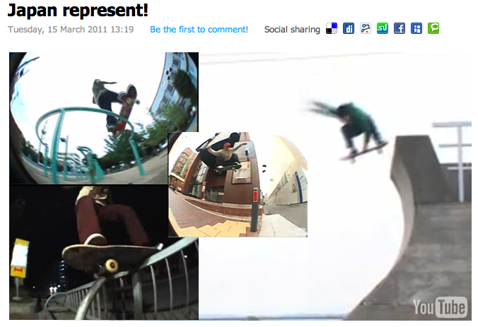 NEWS Slapのウェブサイトで"Japan Represent!"と題した記… ──TRUE JAPANESE NINJAS 2011.03.16 Slapのウェブサイトで"Japan Represent!"と題した記事を発見。 内容は、読者が参加できるForumのコーナーに好きな日本人スケーターのパートをアップしあうというもの。 現在はデシ、ドラボン、丸山晋太郎、岡田 晋、中島壮一朗、池田幸太など、そうそうたる面子がアップされている。これは要チェック。