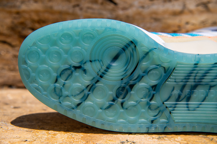 アイスブルーのクリアアウトソールに手書きのサインを配置。