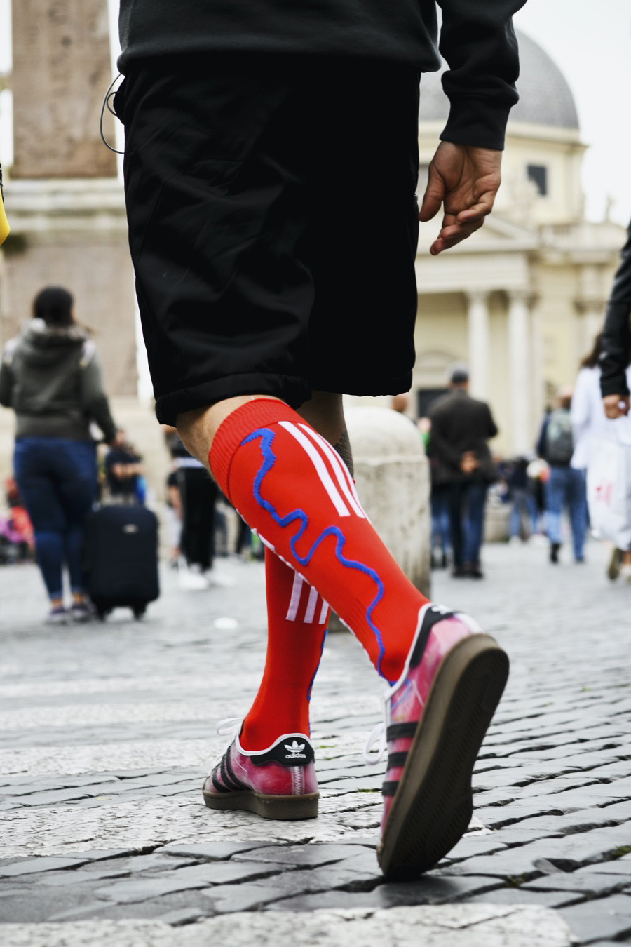 ハイファッションに精通したブロンディらしく、アッパーには大胆にもクリアなPVC素材を採用。さらにシースルーの本モデルに映える3色のソックスも付属。