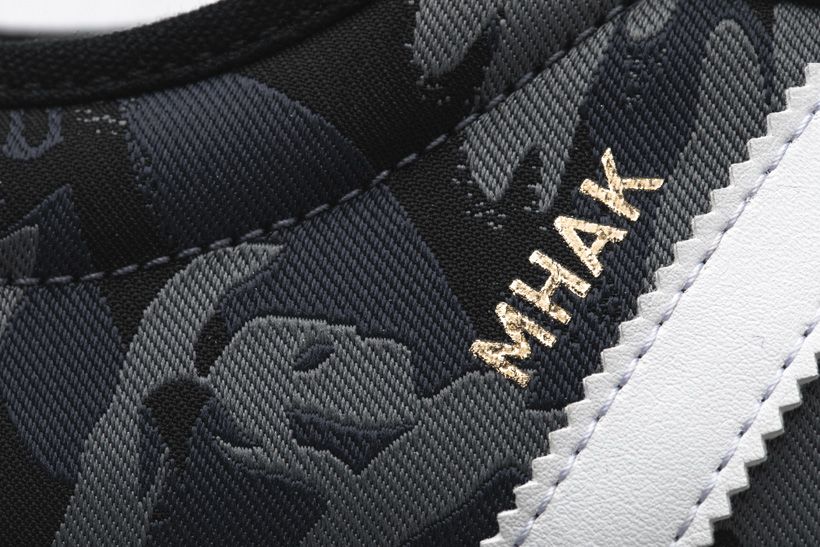 アッパーの両サイドのキャンバス部分にはアーティストがデザインした迷彩柄を織りで表現。ゴールドのMHAKのプリントもゴージャス。