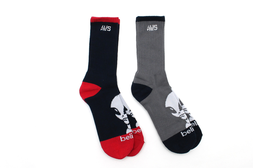 織りで宇宙人とbelieveの文字を表現したソックス。履き口部分にはAWSの刺しゅうが入る。AWS Believe Sock 各色ともに¥1,512