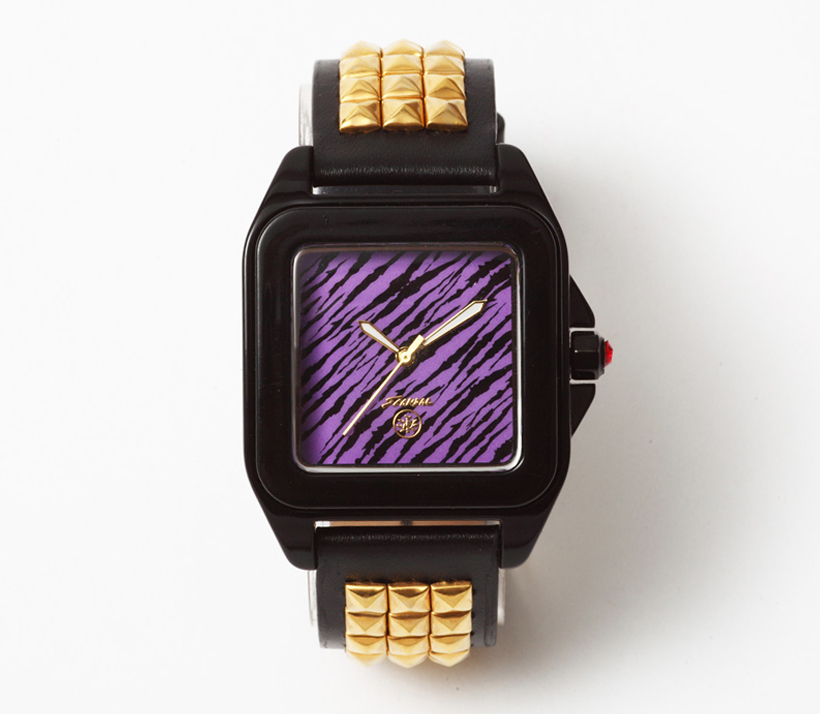 バンドに打ち込まれたゴールドのスタッズがロックな雰囲気を醸し出す。赤く輝くリューズのジルコニア・クリスタルがアクセント。Scandal Gold ¥14,700