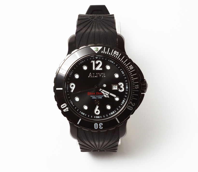Alive史上初となる本格ダイバーズウォッチ。スポーティなデザインとラグジュアリーな雰囲気を融合。100m/330ftの本格的な防水機能を装備。Diver Down All Black ¥19,950