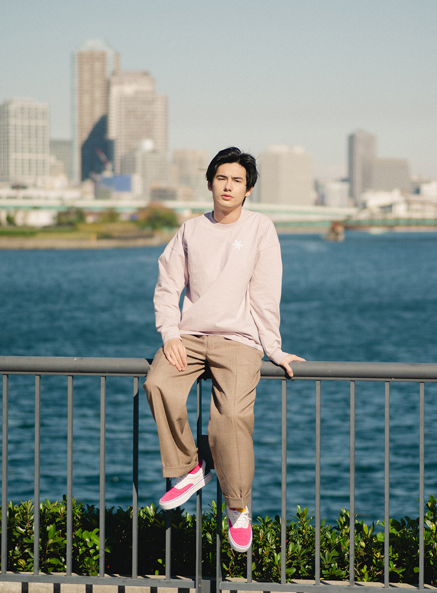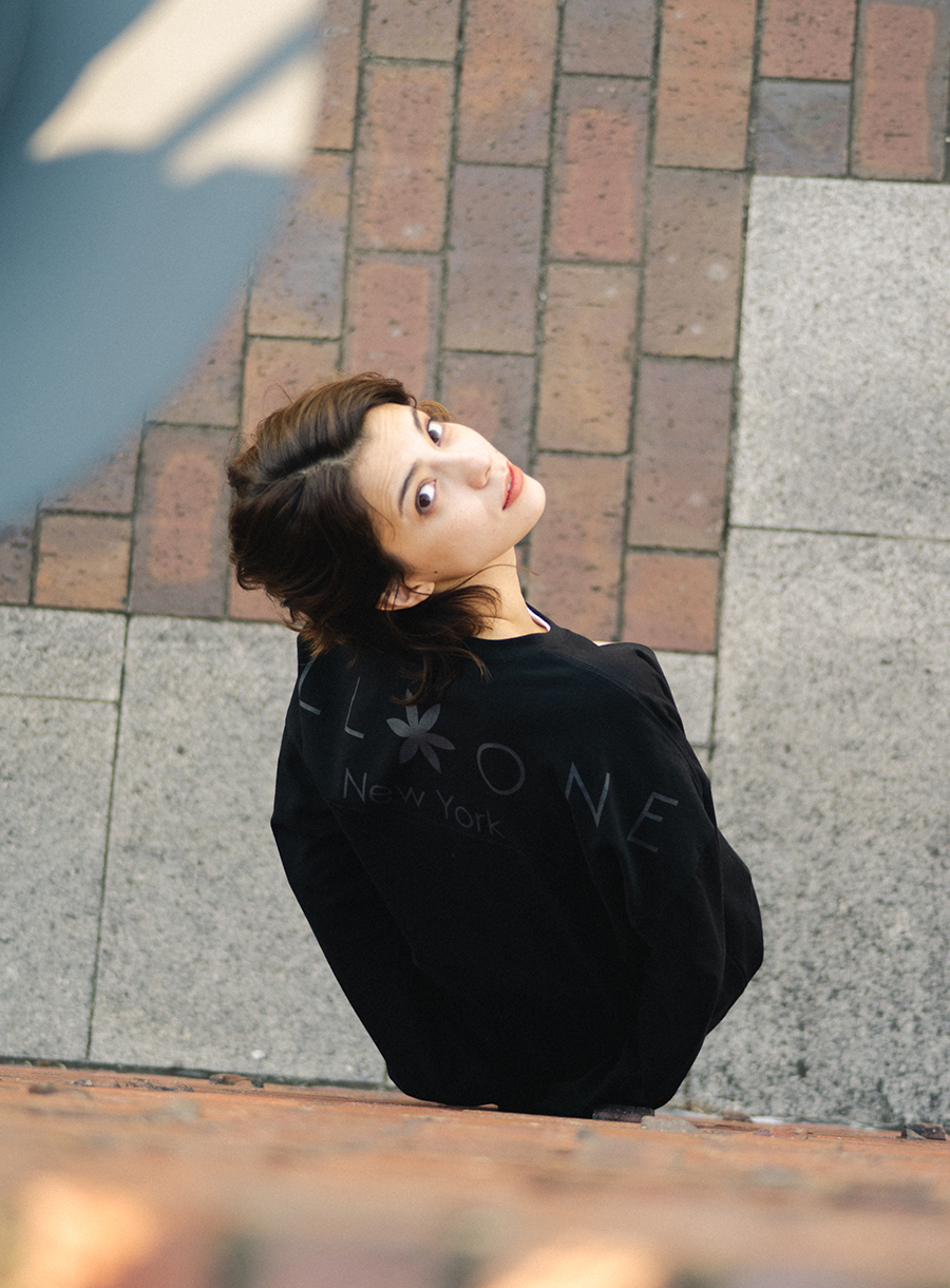 縦にレイアウトしたバックプリントが主張するLS Tシャツ。ボディと同色の裾の刺しゅうもさり気なく主張。Back Vertical Print L/S Tee 各色ともに¥9,900