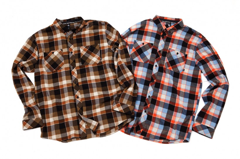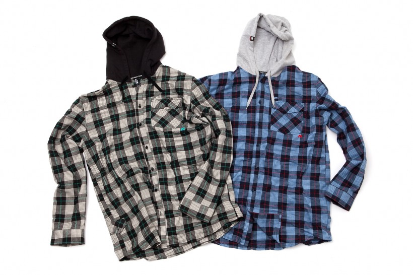 これ1枚でネルシャツ×パーカのレイヤードスタイルを実現できるすぐれもの。フード付きネルシャツ。各色ともに¥12,600