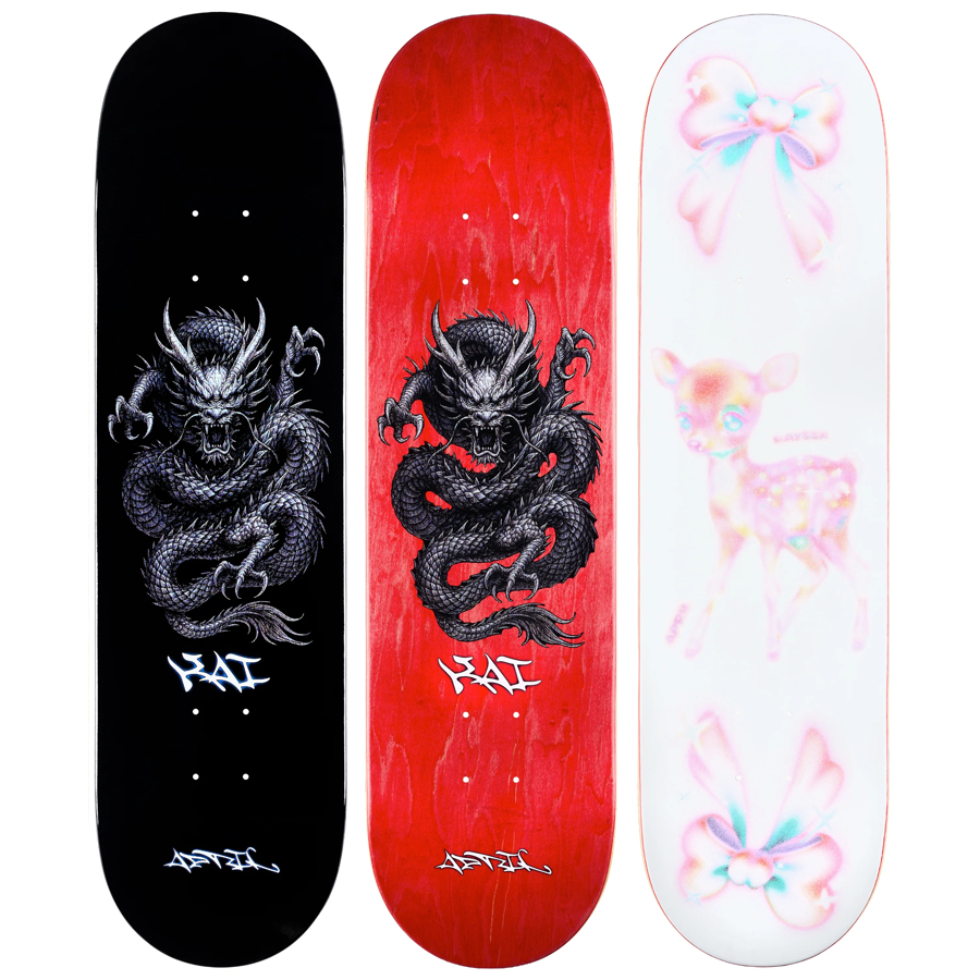 写真左から、Kai Kishi Fantasy Black Dip(8 / 8.25インチ)¥14,300、Kai Kishi Fantasy Red(8 / 8.25インチ)¥14,300 Kids(7.37インチ)¥12,100、Rayssa Leal Bow(8 / 8.25インチ)¥14,300 Kids(7.37インチ)¥12,100。