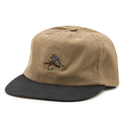 写真左から、フライフィッシングの針をフロントに刺しゅうした6パネルキャップ Dryfly Hat ¥6,264、フロントに配置したロゴマークが存在感抜群のメッシュキャップ Hook Hat ¥5,184