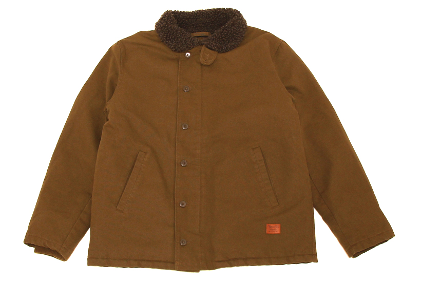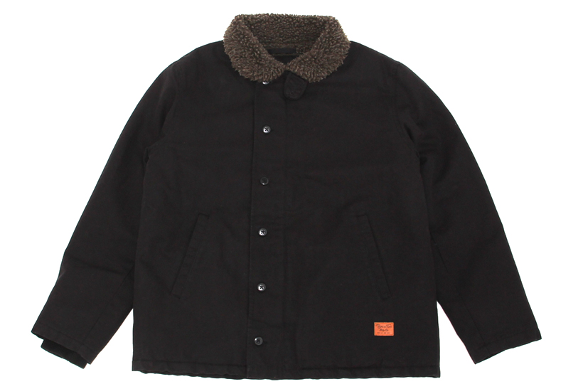 もはやストリートの定番アイテムとして活躍中のデッキジャケット。中央からズレた前合わせやレザーパッチがさり気ないアクセント。Mast Jacket 各色ともに¥25,920