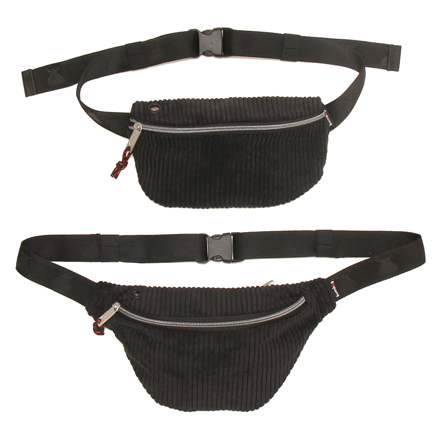 オールブラックのコーデュロイボディにシルバーのジップが映える。写真左から、Midnight Pouch ¥3,780、Midnight Basic ¥5,400