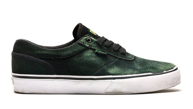 上が新品で下がスケートボードで消耗したシューズ。アッパーが削れることで下地のグリーンが現れているのがわかる。