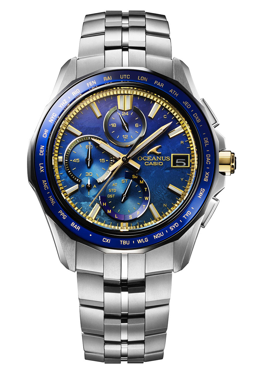 加熱処理で表面に結晶模様を施した再結晶チタンを使用し、ダークブルーからターコイズブルーに変化するグラデーション蒸着で変わり続ける海を表現。OCEANUS OCW-S7000SS ¥275,000