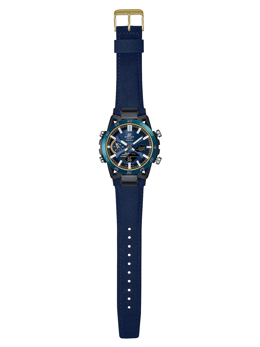 サスペンションアームデザインのECB-2000をベースに、機能性に優れたメイド・イン・イタリーのブルーのアルカンターラ®製バンドを使用。EDIFICE ECB-2000SS ¥47,300