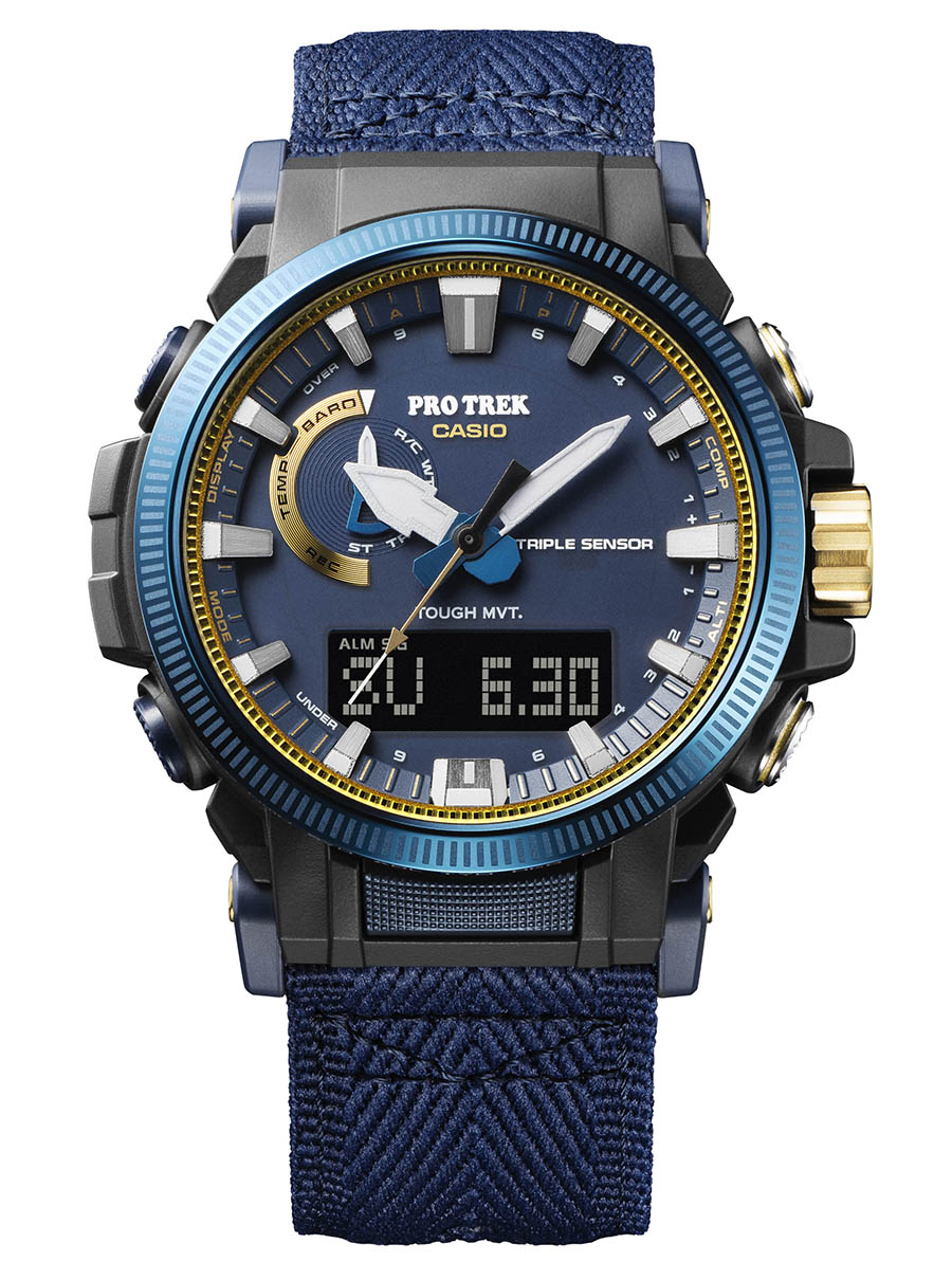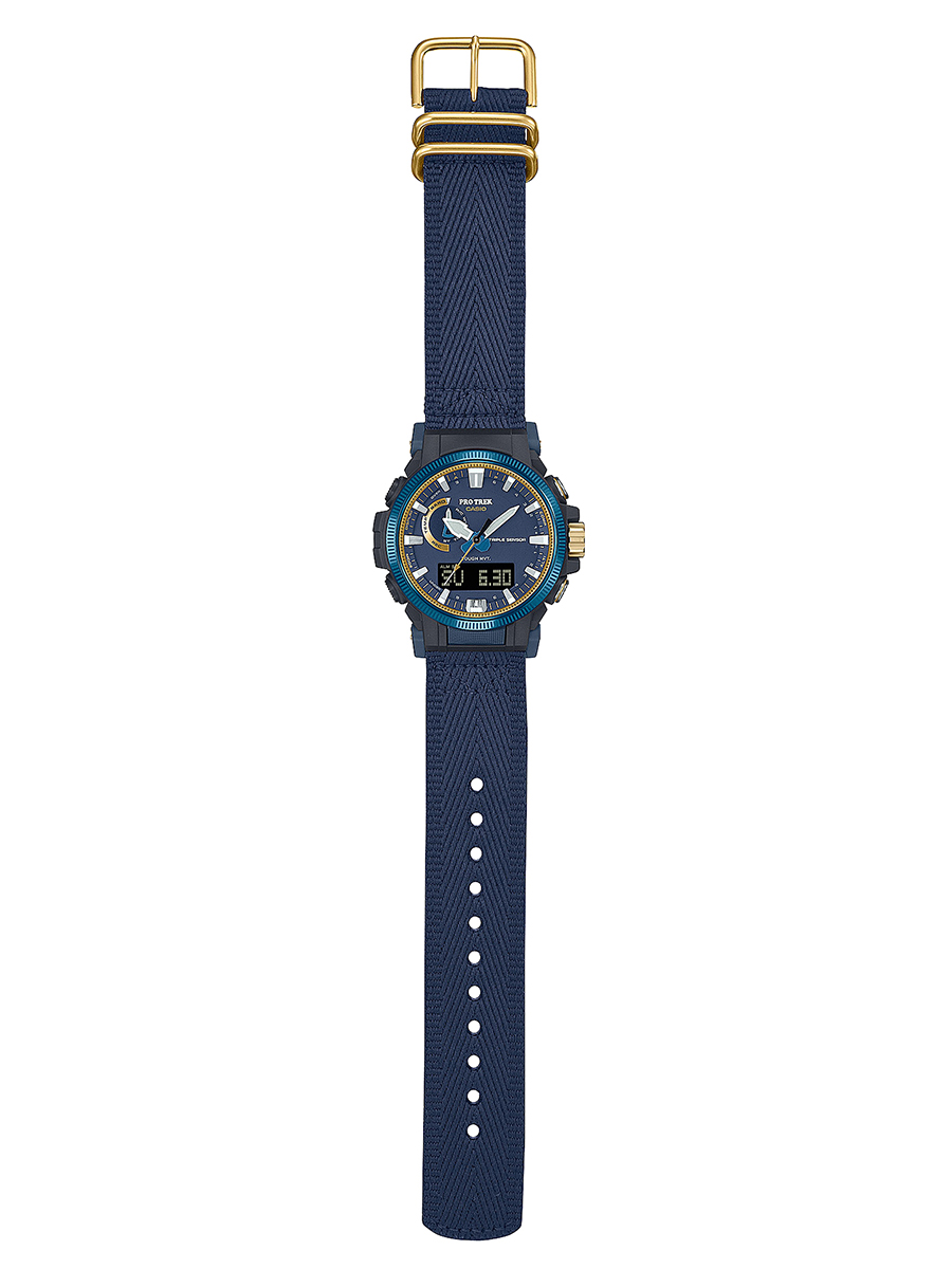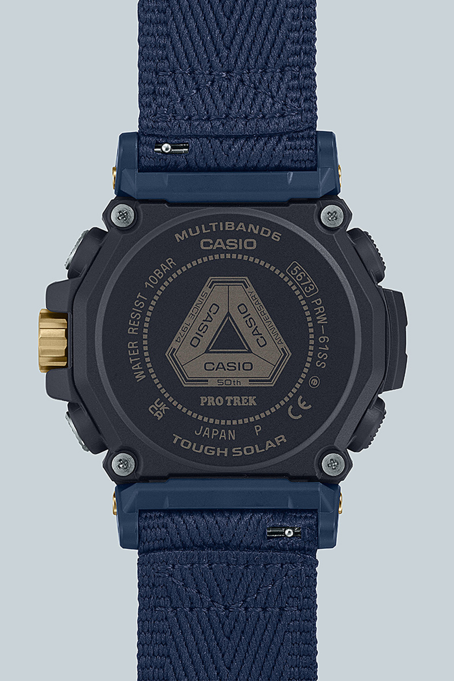 本格アウトドアウオッチのPRO TREKはエコ素材がベース。再生PET素材を難燃性のクロスバンドに、バイオマスプラスチックをケースや裏蓋に使用していています。PRO TREK PRW-61SS ¥77,000