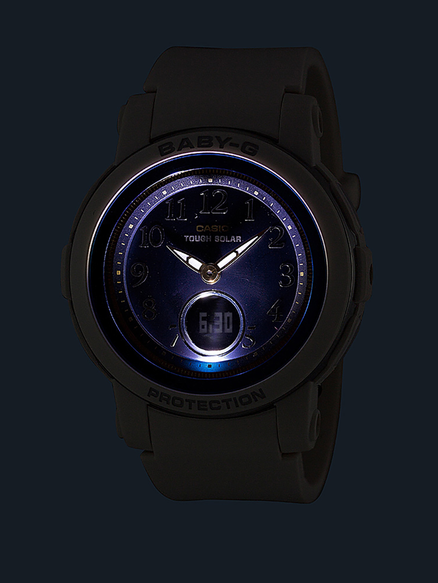 シンプルなラウンドケースのBGA-290のデザインをベースにバイオマスプラスチックを採用し、タフソーラーを搭載したモデル。BABY-G BGA-S290SS ¥24,750