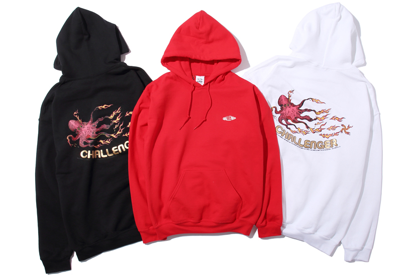 フロントの左胸にはCHALLENGERのプリント、バックにタコファイヤーをプリントしたフーディ。すべて¥10,800