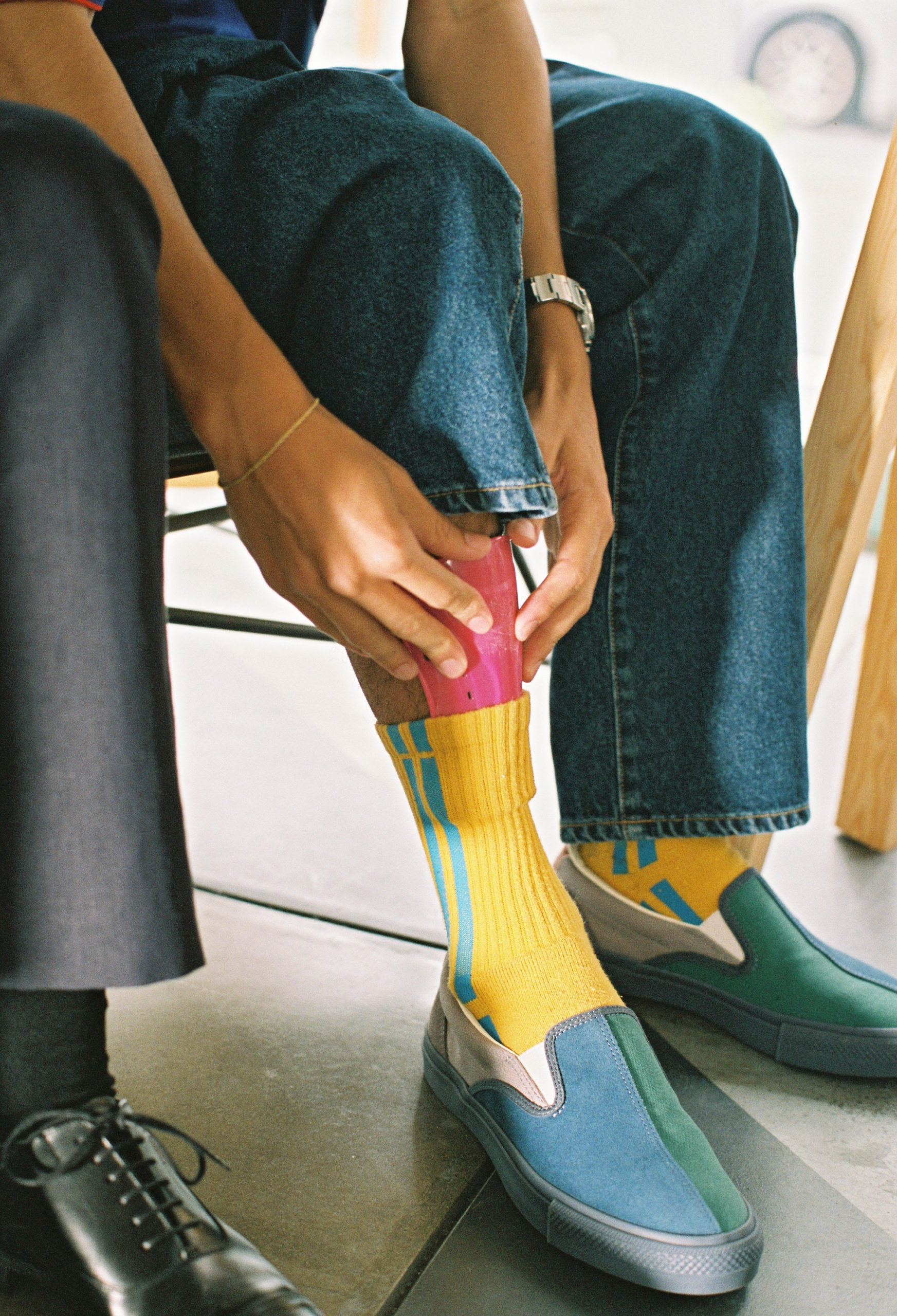 スエードアッパーを縦に切り替えた大胆なデザインのスリップオン。ヒール部分のパッチもさりげないアクセント。CS SLIP-ON SK SAYHELLO + ¥14,300